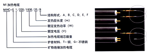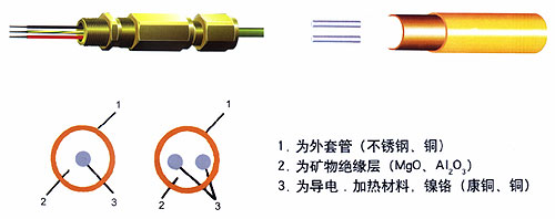 礦物絕緣加熱電纜是采用 單根或多根合金電熱絲作為發(fā)熱源、高純度、高溫、電熔結(jié)晶氧化鎂作導(dǎo)熱絕緣體,無(wú)縫連續(xù)不銹鋼或銅管作為護(hù)套,采用特殊生產(chǎn)工藝制造而成。有強(qiáng)腐蝕作用的場(chǎng)所可外加PE或低煙無(wú)鹵的外套。