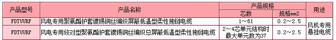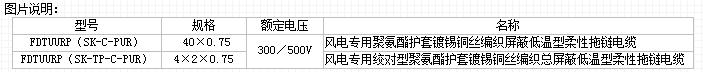 額定電壓300/500V及以下風電專用低溫型柔性拖鏈電纜產品型號、規格及主要參數使用特性:電纜移動敷設時,使用溫度范圍為:-40℃~+90℃;電纜固定敷設時,使用溫度范圍為-50℃~+90℃。固定敷設