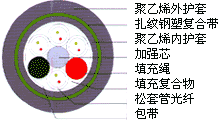 產品型號: GYSTY53也叫(GYTY53) 光纖松套 纜芯填充油膏 金屬中芯加強PE內護套 雙面涂塑軋紋鋼帶粘結PE外護套 | ||||